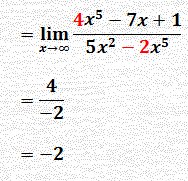 وناتج النهاية (درجة البسط = درجة المقام = 5) يساوي معامل أكبر أس في البسط مقسوم على معامل أكبر أس في المقام فهنا المعاملات هي i4 , -2, وبناء على ذلك يكون الحل كالآتي :