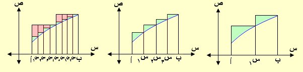 لاحظ أيضاً رؤوس أشباه المثلثات المظللة تقترب من المنحنى أكثر في الشكل الثالث عنها في الشكل الثاني أي بزيادة التجزيء تنقص المساحة