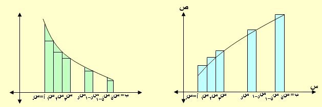 ففي الشكل الأول المساحة تحت المنحنى أقل من مجموع مساحتي المستطيلين بفارق الجزء المظلل باللون الأخضر