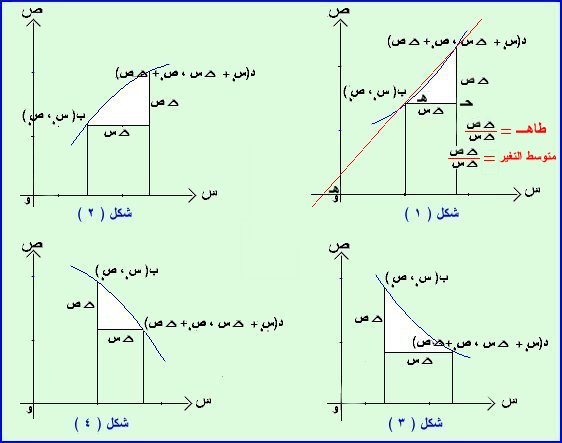 في دراستنا للعلوم المختلفة نلاحظ وجود علاقة بين المتغيرات التي يمكن التعبير عنها بصورة دالة وهدفنا البحث عن العلاقة بين ما يحدث من تغير للدالة بناء على التغير في المتغير المستقل وكذلك الحال لدالة متوسط تغير الدالة بالنسبة لمتغيرها المستقل وما يترتب على ذلك من استنتاجات مفيدة عملياً. فبحثنا في الدالة ص = د(س) = س2 (يكفي كتابة ص أو د(س) ) فكون س تغيرت من 1 إلى 2 مثلاً فقيمة التغير في س = 2 ـ 1 = 1 ويكون التغير المناظر في ص = (2)2 ـ (1)2 = 4 ـ 1 = 3 ويرمز للتغير في س بالرمز ∆ س ويقرأ دلتا س حيث دلنا تعني بالعربية التغير في وذكرنا ∆ س يعني الجملة العربية " التغير في س " ، ∆ س رمز واحد للتغير في س ولا يعني شيء فصل ∆ عن س فمثلاً س × ∆ س لا يساوي ∆ س2 إطلاقاً وكذلك للتغير في ص نرمز له ∆ ص وعلى العموم تغير س من س1 إلى س2 الذي يتبعه تغير ص من ص1 إلى ص2 حيث س المتغير المستقل ، ص المتغير التابع فيكون: ∆ س = س2 ـ س1 ، ∆ ص = ص2 ـ ص1 والتغير في س دال على التغير في قيمتها بالزيادة أو النقص والحال نفسه مع ص وعليه فقد يكون التغير في س ، ص موجباً أو سالباً، الأشكال الأربع التالية توضح تمثيلاً بيانياً للمقدارين ∆ س ، ∆ ص وذلك للدالة ص = د(س) ، حيث ب (س0 ، ص0) ، د (س0 + ∆ س ، ص0 + ∆ ص) ففي الشكلين (1 ، 2) تزيد قيمة ص بزيادة قيمة س ولذا تكون ∆ س ، ∆ ص موجبة وفي الشكلين (3 ، 4) نجد أن ص تنقص بزيادة س ولذا تكون ∆ س موجبة في حين ∆ ص سالبة.