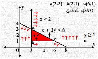 السؤال السادس: يُنتج مصنع للجلود نوعين مختلفين من الحقائب الجلدية , ويستغرق مدة i1hفي إنتاج كل حقيبة من النوع الأول , مدة i2hفي إنتاج كل حقيبة من النوع الثاني . والمصنع ملتزم بإنتاج حقيبتين على الأقل من النوع الأول , وحقيبة على الأقل من النوع الثاني يومياً . إذا كان عدد ساعات العمل لا يزيد عن i8hفي اليوم . فأجب عما يأتي : a) اكتب نظام من المتباينات يمثل هذا الموقف. ← b) مثل نظام البيانات بيانياً . وحدد رؤوس منطقة الحل المحتملة. ← c) إذا كان المصنع يربح iBD 8 في كل حقيبة من النوع الأول , iBD 6في كل حقيبة من النوع الثاني , ↓ فاكتب دالة الربح. d) أوجد عدد الحقائب الجلدية التي يجب على المصنع إنتاجها من كل نوع يومياً للحصول على أكبر ربح ↓ ممكن , وأوجد قيمته. الحل بتكوين المتباينات والجدول والتمثيل البياني كما هو مبين نوجد دالة الربح ونعوض للحصول على المطلوب c) دالة الربح هي: ƒ(x,y) = 8x + 6y (2,3): ƒ(2,3) = 8×2 + 6×3 = 16 + 18 = 34 (2,1): ƒ(2,1) = 8×2 + 6×1 = 16 + 6 = 22 (6,1): ƒ(6,1) = 8×6 + 6×1 = 48 + 6 = 54 d) يتبين أنَّ اكبر ربح هو iBD 54 , ويحصل عليه عندما ينتج i6حقائب من النوع الأول وحقيبة واحدة من النوع الثاني يومياً.