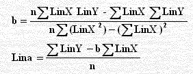 المعامل a الثابت ليس حداً ( كما في Y = a + b X) فظهر بالصورة Y = aXb يمكن تحويلها لخطية (لوغاريتم) أو Y = a bx يمكن تحويلها لخطية (لوغاريتم) أو كمعادلة لوغاريتمي Y = a + LinX كما يمكن بتحويلها لخطية بتغير تعريف المتغيرات فمثلاً Y = aXb بأخذ لوغاريتم الطريفين نحصل على LinY = Lina + b LinX وذلك حسب قوانين الأسس وبوضع LinY = Y , Lina = a , LinX = X نحصل على المعادلة المرادفة Y = a + bX وبالتالي نحسب قيم a , b من: