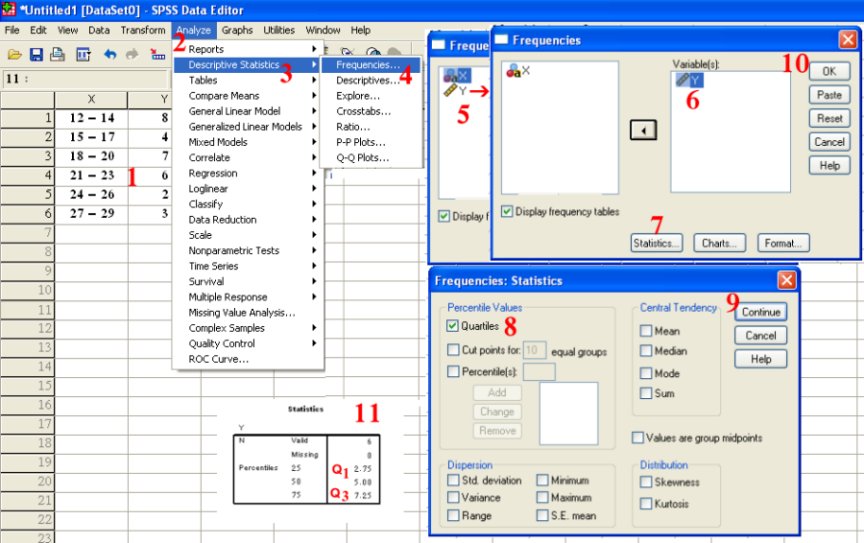 نحدد رتبتي الربيعين الأول (ن ÷ i4) والثالث [i3(ن ÷ i4)] حال ن تقبل القسمة على i4وإلا نأخذ متوسط القيمتين اللتين تقع بينهم قيمة ن ÷ i3 ، 4(ن ÷ i4) والمثال التالي يبين ذلك المعنى: